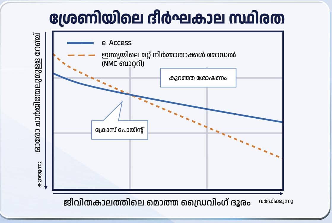 സുസുക്കി ഇ-ആക്സസിലുള്ള എൽഎഫ്പി ബാറ്ററികളിൽ, റേഞ്ച് നിലനിർത്തൽ വളരെ മികച്ചതാണ്. വർഷങ്ങളോളം കൂടുതൽ സ്ഥിരതയുള്ള റേഞ്ച് റൈഡർമാർക്ക് നൽകുന്നു. ഒപ്പം ബാറ്ററിയുടെ ആയുസ്സ് ദീർഘിപ്പിച്ച് സ്കൂട്ടറിന്റെ ആയുസ്സ് വർദ്ധിപ്പിക്കുന്നു.